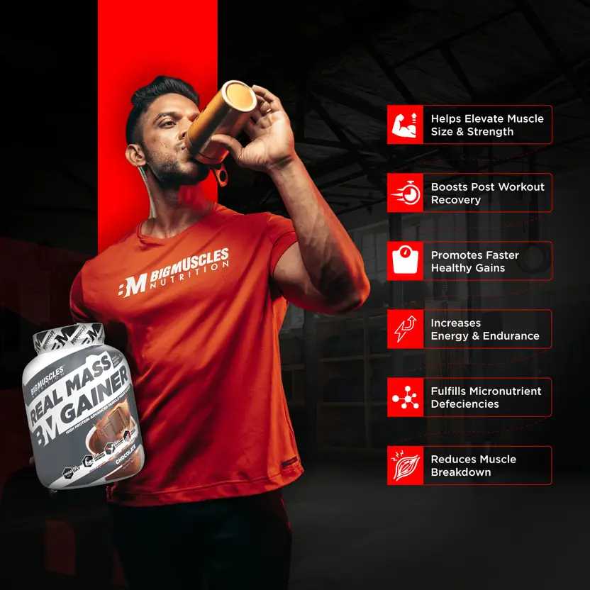 BIGMUSCLES REAL MASS GAINER Contains High-Quality Protein in a Wellness Formula.